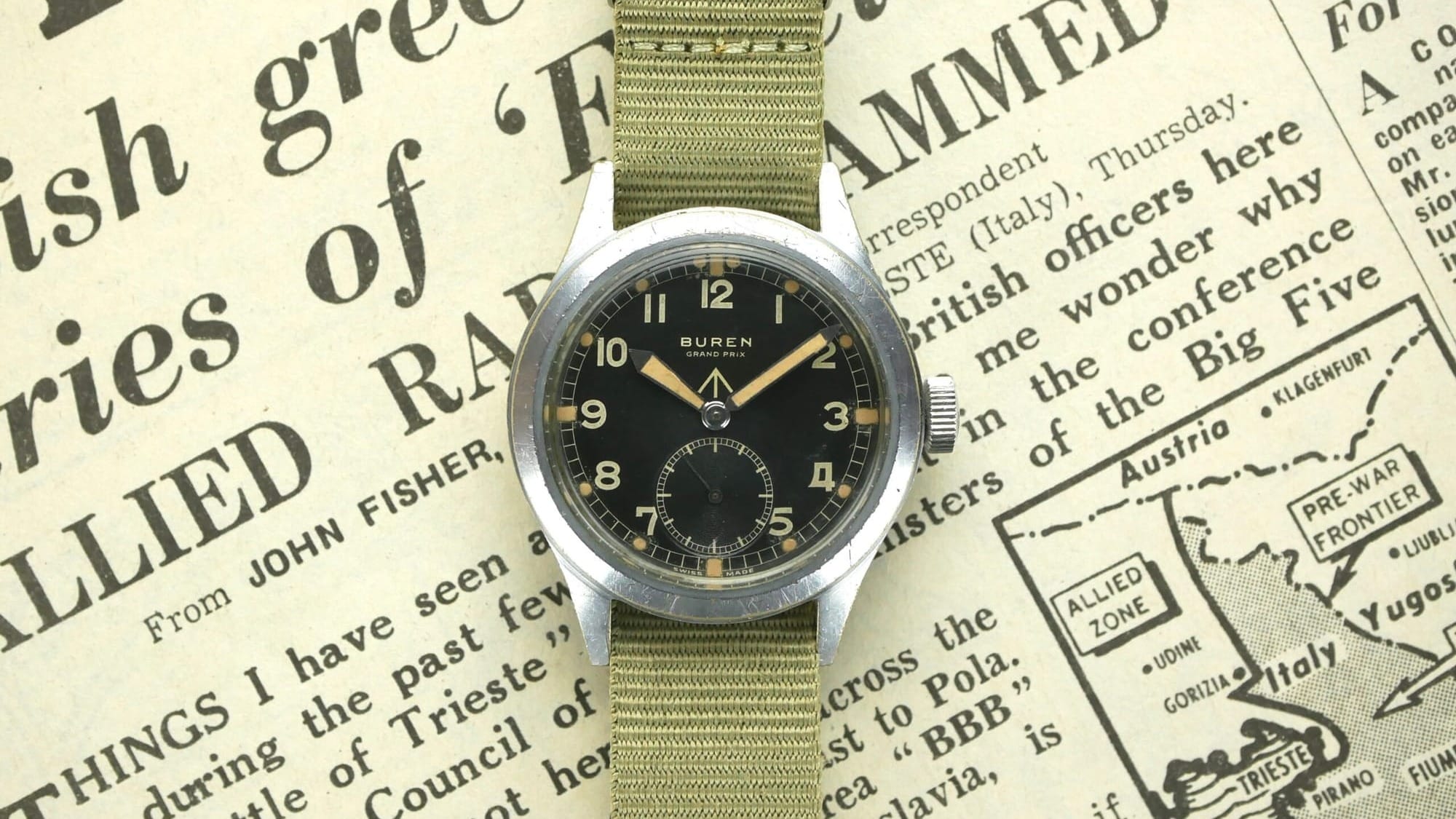 Buren may not be the first name that comes to mind when collectors talk about the Dirty Dozen, but their contribution to the Ministry of Defence's WWW specification holds its own among the twelve. Produced in the final year of the war, the Buren WWW carried all the design cues required by the contract: a no-nonsense black dial with luminous Arabic numerals, a crisp railroad minute track, and a sub-seconds register planted neatly at six o'clock. Depending on the batch, the watch left the factory with either sword hands or the simpler pencil style, both painted with radium to meet the lume requirement.