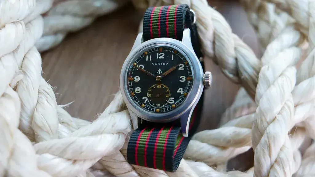 Vertex, the London-based firm founded by Claude Lyons with strong Swiss manufacturing ties, delivered one of the most straightforward watches in the Dirty Dozen. The stainless steel case measured about 35 mm across with 18 mm lugs, perfectly proportioned for military duty without excess.